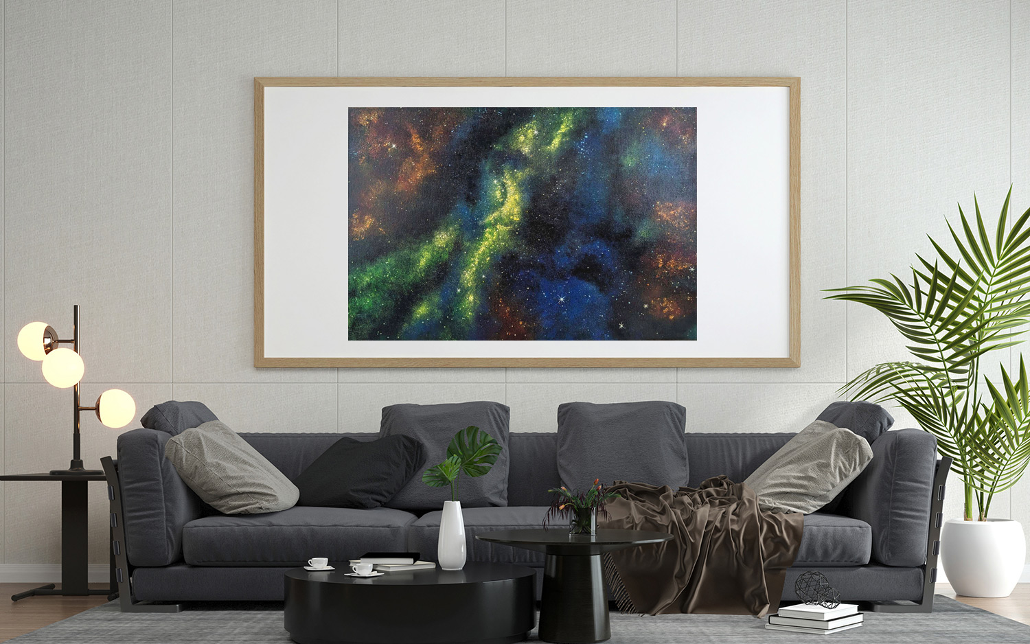 Dieses Werk ist im Kontext einer Verliebtheit in (m)einen Naturwissenschaftler entstanden. Seine Begeisterung für die unendlichen Weiten des Alls steckte mich an, und gleichzeitig eröffnete mir die Beziehung zu ihm ungeahnte Sphären und Möglichkeiten. All das steckt in diesem Bild.